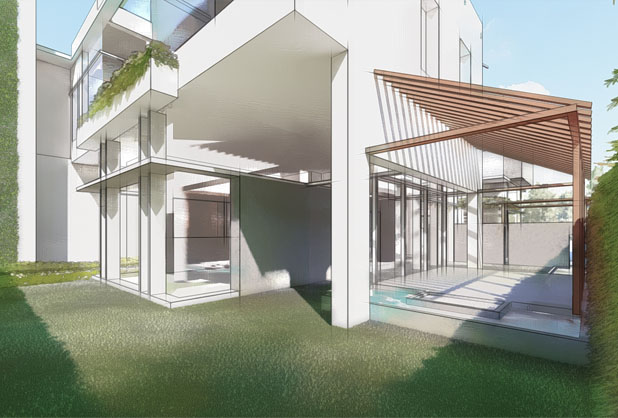 This design option aims at creating different hierarchy of spaces at different levels while maximizing the open spaces with a flow of greens through the house. A very large inside-outside courtyard forms the heart of this design option which is enveloped by the outward facing public spaces at the ground floor and overlooked by the private inward facing spaces on upper floors. Connections between both spaces are through this living green heart, which fluidly moves in between uses and functions through a series of smaller courtyards.
