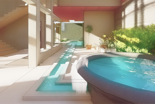This design option explores the use of solids and circles, using curves to highlight the flow of spaces. Each private and public function has its own sequence of spaces in while still affording privacy and views. The primary inside-outside element is a waterway leading to a pool accessed visually and physically through a multitude of ways.