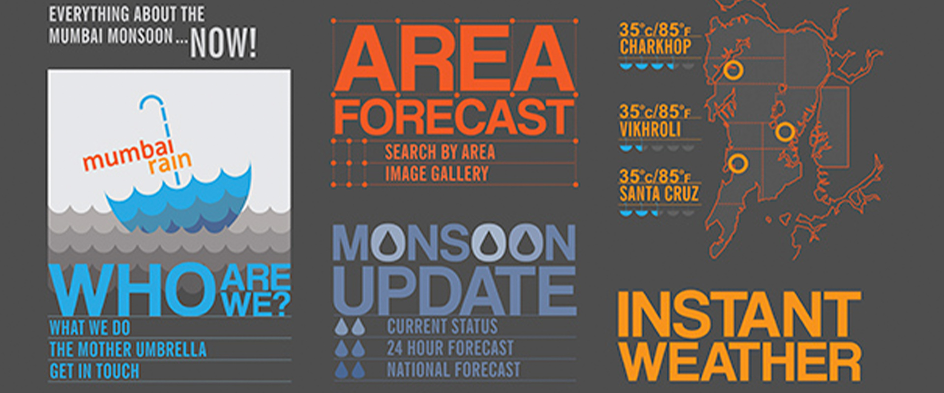 A website and identity design project aimed at delivering a fresh, youthful postcard-like site, which predicts micro weather (for a 3km radius) and allows for instant feedback on aspects of life typically affected by the rain in Mumbai - weather, traffic, information and social networks.